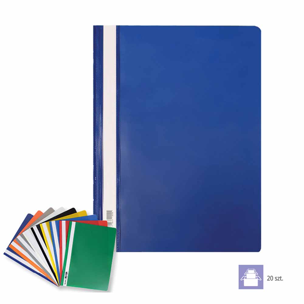 Skoroszyt wyposażony jest w wymienny, papierowy pasek do opisu, który ułatwia identyfikację zawartości. Dwa wycięcia umożliwiają szybkie i łatwe wysuwanie paska, co dodatkowo poprawia funkcjonalność. Zaokrąglone rogi obu okładek zwiększają komfort użytkowania i zapobiegają uszkodzeniom innych dokumentów.