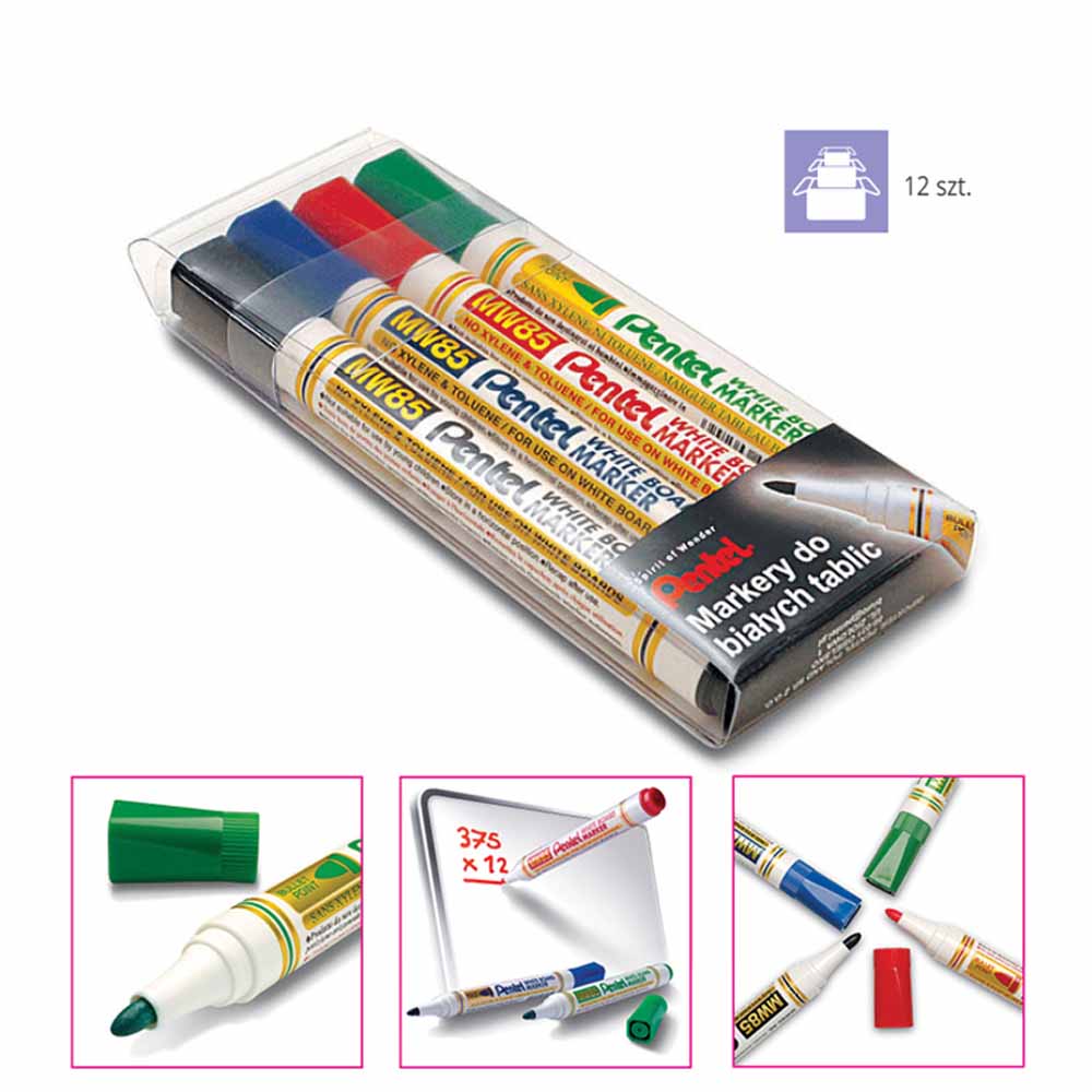Marker do tablic suchościeralnych Pentel MW85 wyposażony jest w okrągłą końcówkę, która zapewnia precyzyjne i płynne pisanie. Idealny do prezentacji, notatek i rysunków na tablicach suchościeralnych.