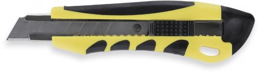 nóż biurowy do rozcinania różnych materiałów wysuwane 7-częściowe ostrze z możliwością odłamywania stępionych części blokada unieruchamiająca ostrze obudowa wykonana z polistyrenu (żółte elementy) i ABS'u (niebieskie elementy) ostrze wykonane ze stali hartowanej szerokość ostrza: 18mm długość ostrza: 100mm kolor niebiesko-żółty