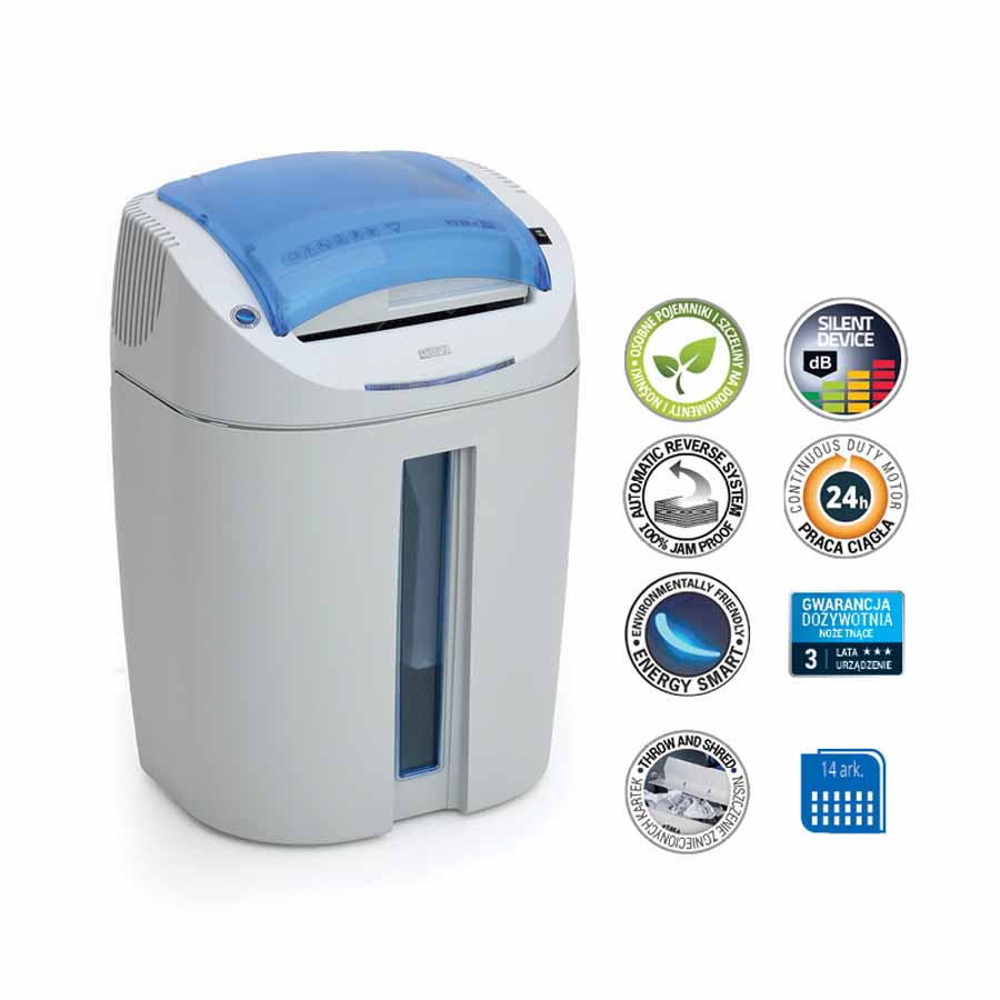 Obudowa niszczarki jest wyposażona w okno umożliwiające kontrolę poziomu napełnienia kosza, a system Eco-Friendly pozwala na korzystanie z pojemnika na ścinki bez potrzeby stosowania worków. Automatyczne odcięcie zasilania w przypadku zaklinowania papieru lub wyjęcia pojemnika na ścinki to dodatkowa funkcja, która chroni urządzenie przed uszkodzeniami.